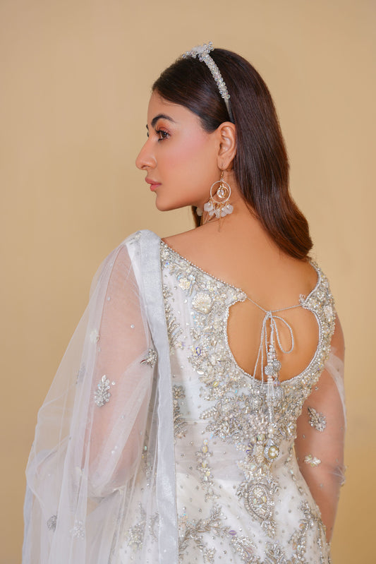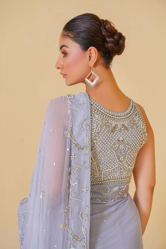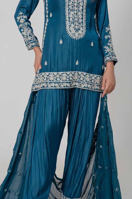 A rose pink lawn shirt, delicately embroidered with shades of blue, paired with a billowing white cotton gharara. The intricate details and airy fabric create a look that is both sophisticated and effortlessly romantic.